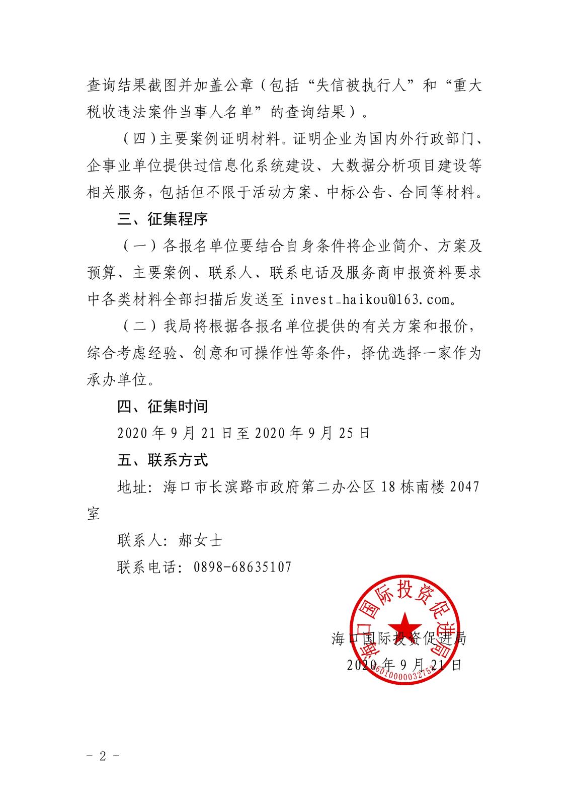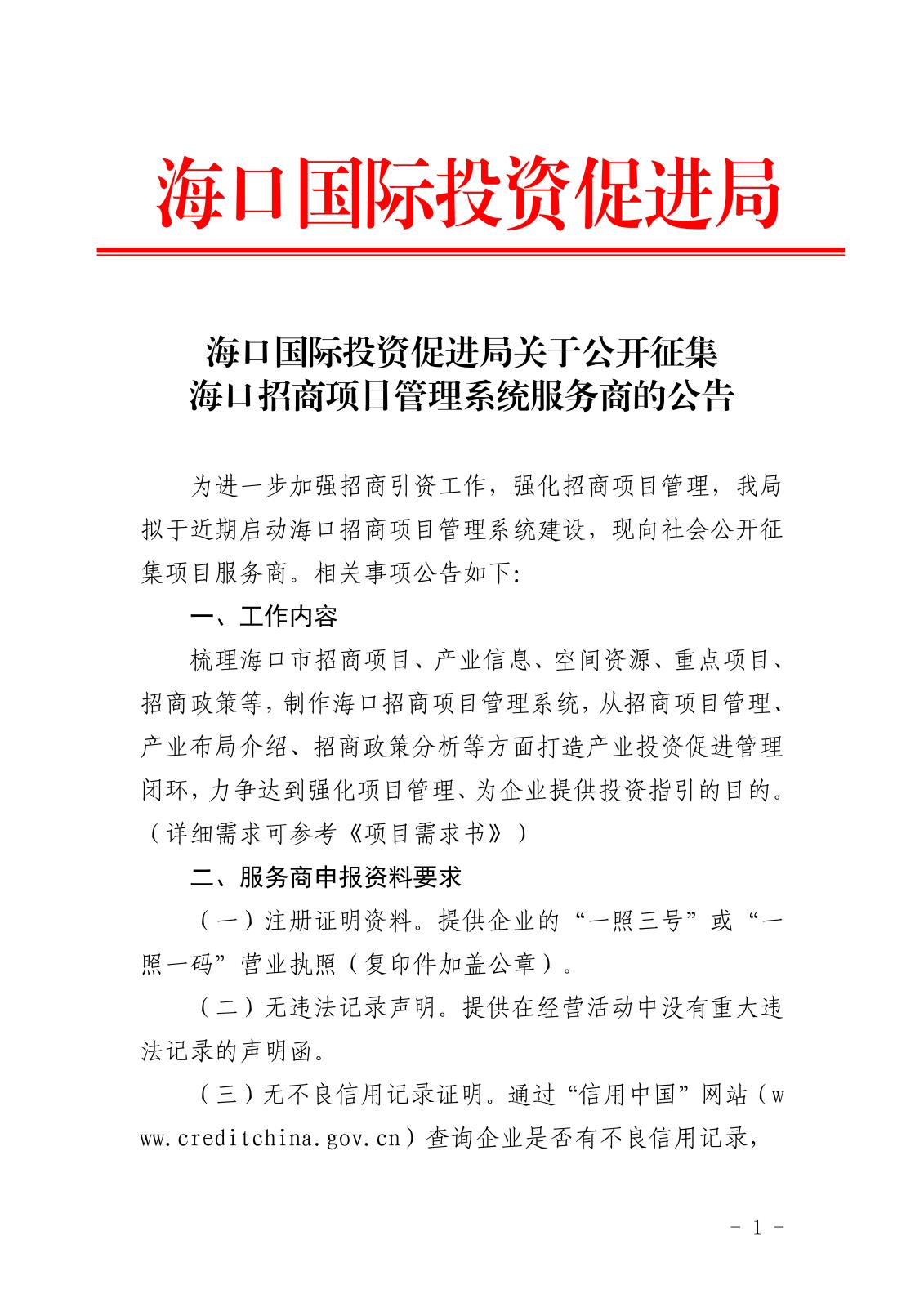 海口國際投資促進局關于公開征集海口招商項目管理系統服務商的公告