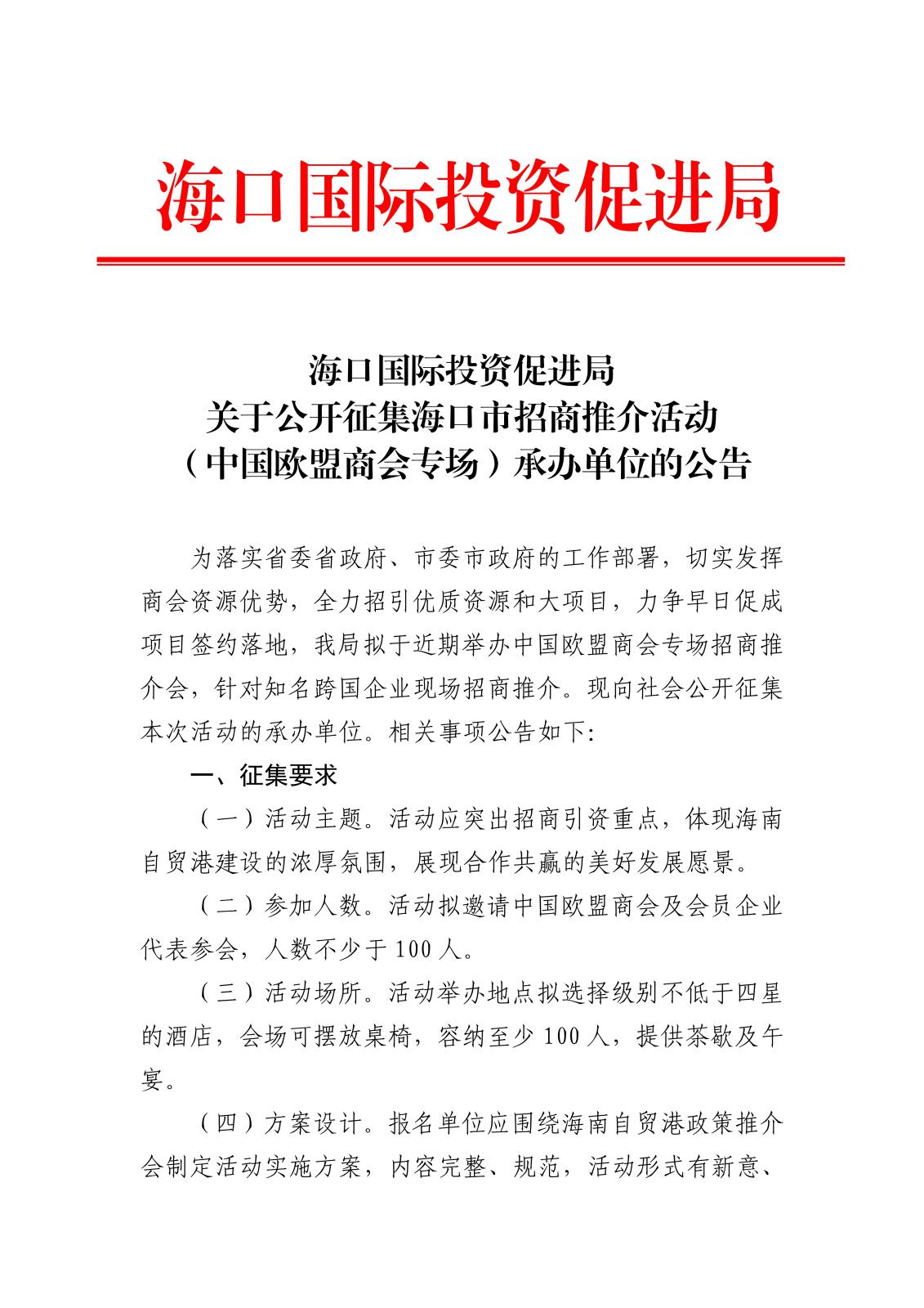 ??趪H投資促進局關(guān)于公開征集??谑姓猩掏平榛顒樱ㄖ袊鴼W盟商會專場)承辦單位的公告