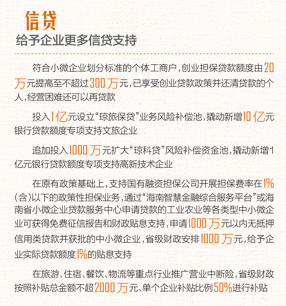 在原有政策基礎上,支持國有融資擔保公司開展擔保費率在1%(含)以下的政策性擔保業(yè)務,通過“海南智慧金融綜合服務平臺”或海南省小微企業(yè)貸款服務中心申請貸款的工業(yè)農(nóng)業(yè)等各類型中小微企業(yè)可獲得免費征信報告和財政貼息支持,申請1000萬元以內無抵押信用類貸款并獲批的中小微企業(yè),省級財政安排1000萬元,給予企業(yè)實際貸款額度1%的貼息支持