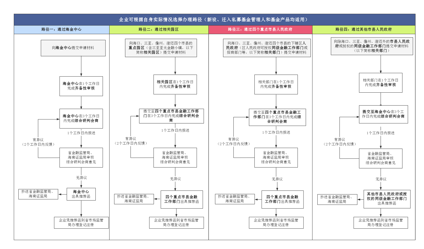 在收到綜合研判會商意見的2個工作日內,海南證監局和省金融監管局反饋無異議意見(省金融監管局未反饋意見視為反饋無異議意見)后,海金中心可向省市場監管局出具推薦函,并抄送省金融監管局、海南證監局。