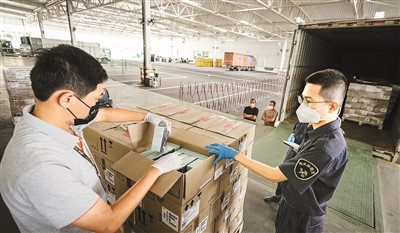 在中免海南國際物流中心,海關工作人員核對完免稅品信息并拍照,這些免稅品將轉運至倉庫“待理貨區”。