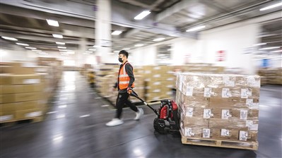 在中免海南國際物流中心,裝卸員轉運剛卸下的免稅品。這里存放成千上萬件的免稅品,要形成一個安全、快速的查驗放行閉環。