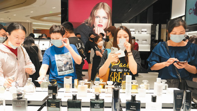 海口國際免稅城人頭攢動,消費者在選購免稅商品。