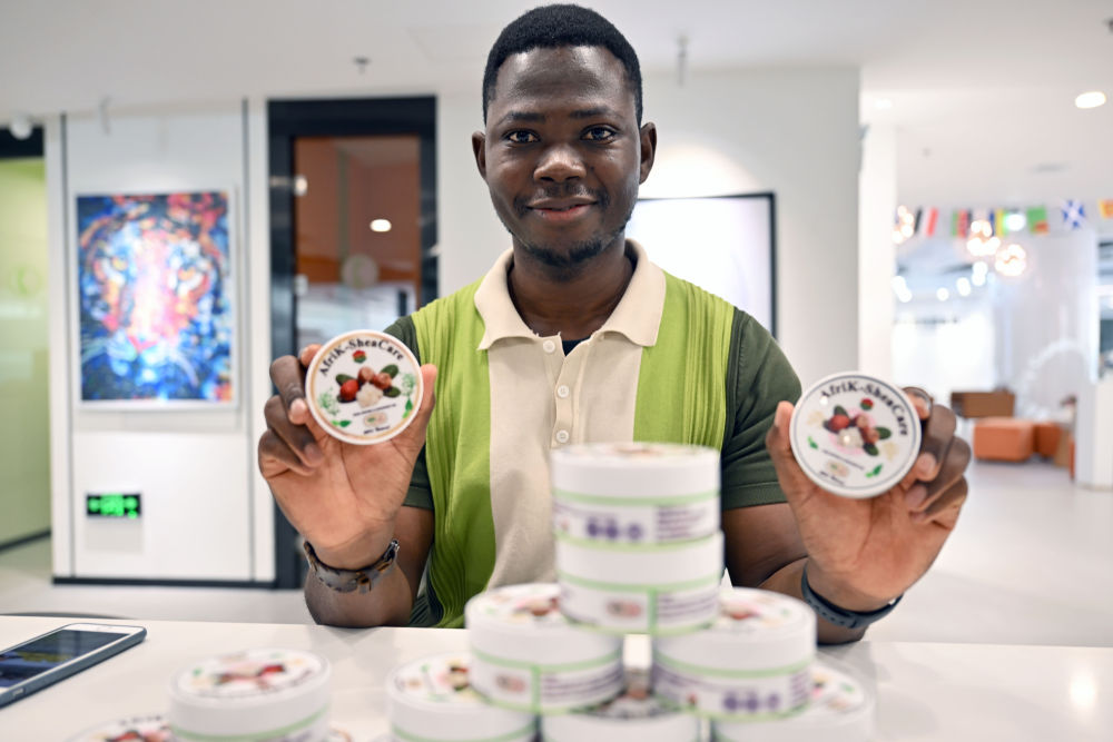 來自加納的金斯福·約翰在海口展示其公司進(jìn)口的乳木果油等非洲產(chǎn)品。新華社記者郭程攝