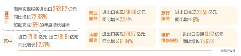 據統計,2022年海南實現服務進出口353.62億元,同比增長22.88%,超額完成15%的年度增長目標。其中,進口171.81億元;出口181.81億元,同比增長112.21%,服務出口增幅大于進口127.2個百分點,帶動服務貿易實現順差10億元。
