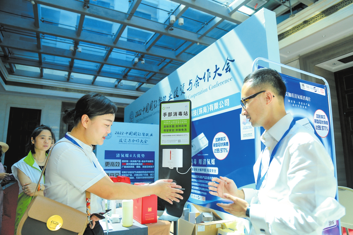 ②在海口魯能希爾頓酒店舉行的龍華區旅文產業招商推介會上,工作人員展示講解產品。(資料圖)本報記者 楊鶴 攝