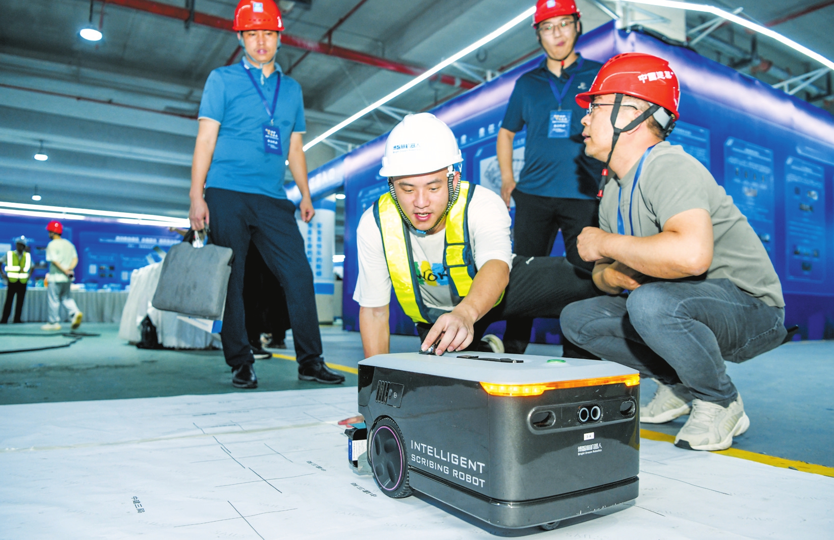 6月26日,中建三局裝飾智慧工地現(xiàn)場觀摩會智能建造展區(qū),工作人員在操作演示智能劃線機器人。