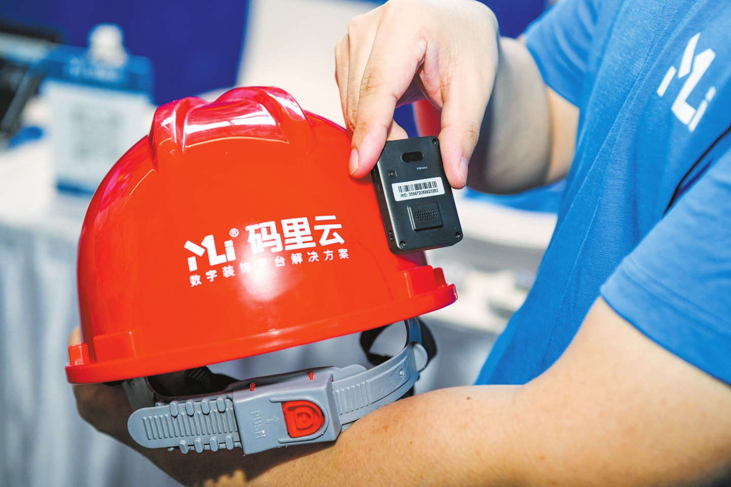 6月26日,中建三局裝飾智慧工地現(xiàn)場觀摩會上展示的智慧安全帽。