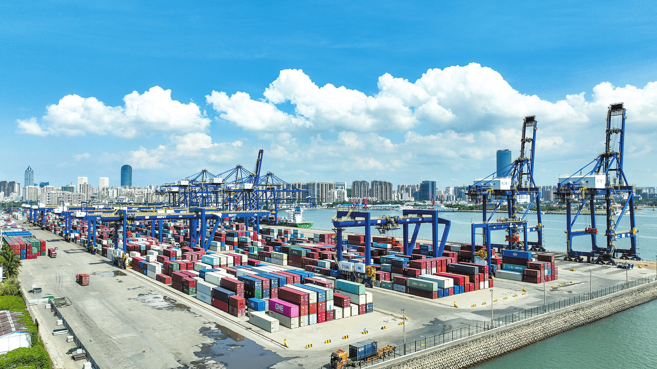 今年1-6月,海口貨物進(jìn)出口總值達(dá)到425.59億元。圖為繁忙的海口港集裝箱碼頭。 本報(bào)記者 楊鶴 攝