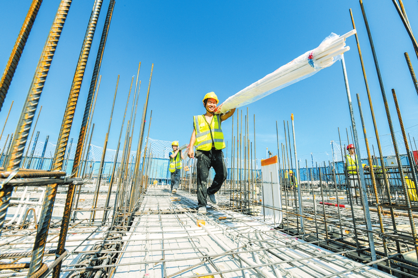 10月5日,在海口江東新區(qū)椰青園S01項(xiàng)目現(xiàn)場(chǎng),施工人員在搬運(yùn)管線。記者 蘇弼坤 攝