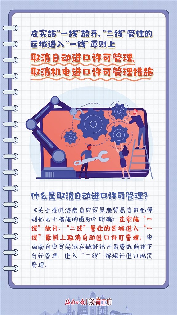 在實施“一線”放開、“二線”管住的區域,進入“一線”原則上取消自動進口許可管理,由海南自由貿易港在做好統計監管的前提下自行管理,進入“二線”按現行進口規定管理。在實施“一線”放開、“二線”管住的區域,進入“一線”取消機電進口許可管理措施,由海南自由貿易港在安全環保的前提下自行管理,進入“二線”按現行進口規定管理。