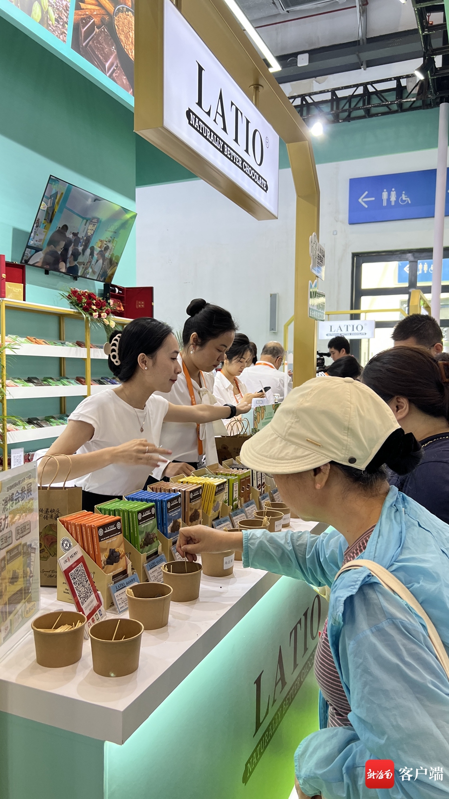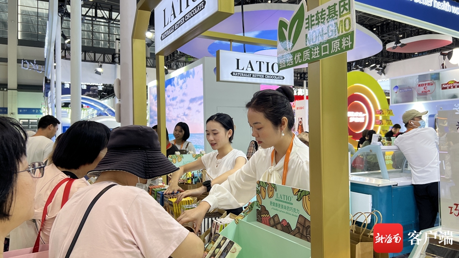 4月15日,第四屆中國國際消費品博覽會(簡稱“消博會”)期間,位于3號高端食品保健品展館的LATIO加拿大巧克力展區,參觀者可免費試吃多種巧克力,感受甜蜜的滋味。