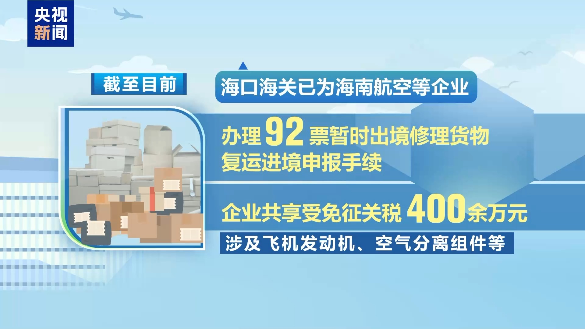 截至目前,海口海關(guān)已為海南航空等企業(yè),辦理92票暫時(shí)出境修理貨物復(fù)運(yùn)進(jìn)境申報(bào)手續(xù),企業(yè)共享受免征關(guān)稅400余萬(wàn)元,涉及飛機(jī)發(fā)動(dòng)機(jī)、空氣分離組件等。