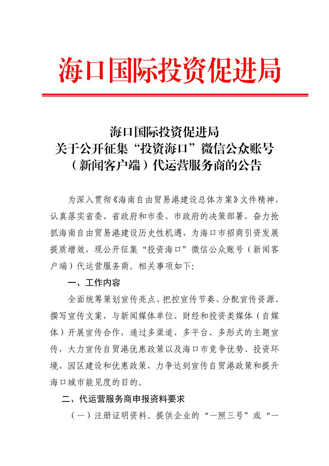 上一篇:海口國際投資促進局關于公開征集“投資海口”微信(新聞客戶端)代運營服務商的公告