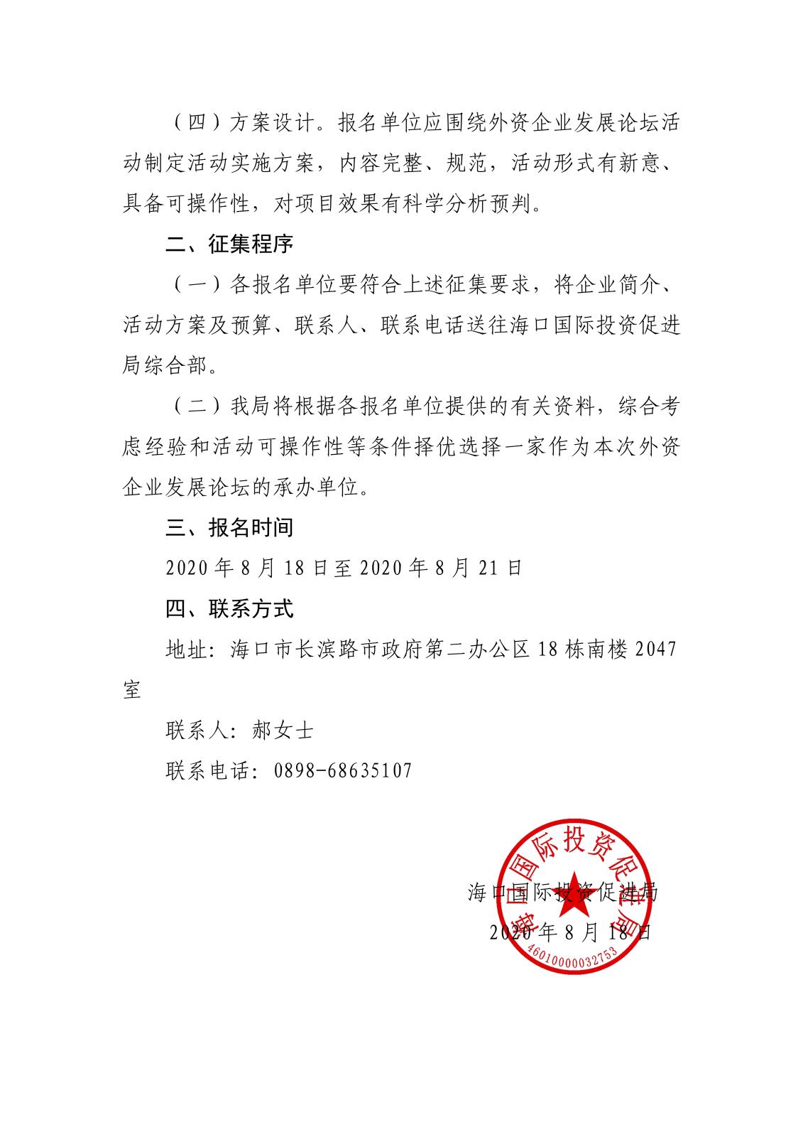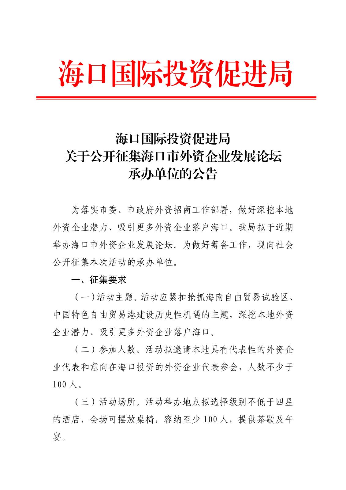 海口國際投資促進局關于公開征集海口市外資企業發展論壇承辦供應商的公告